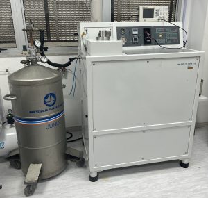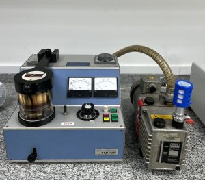 Metalizador de Ouro Balzers Union/FL-9496 Sistema de revestimento por pulverização catódica, usado para depositar filme, finos de ouro sobre as superfícies de amostras biológicas, para análise por microscopia eletrônica de varredura, otimizando a condutividade entre a amostra biológica e o feixe de elétrons do microscópio.