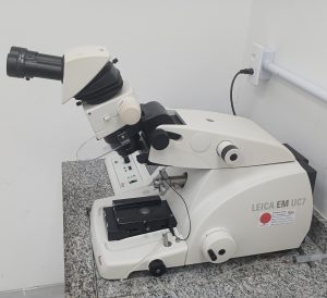 Ultramicrótomo Leica UC7 Equipamento que se destina à execução de cortes ultrafinos para análise por microscopia eletrônica de transmissão.